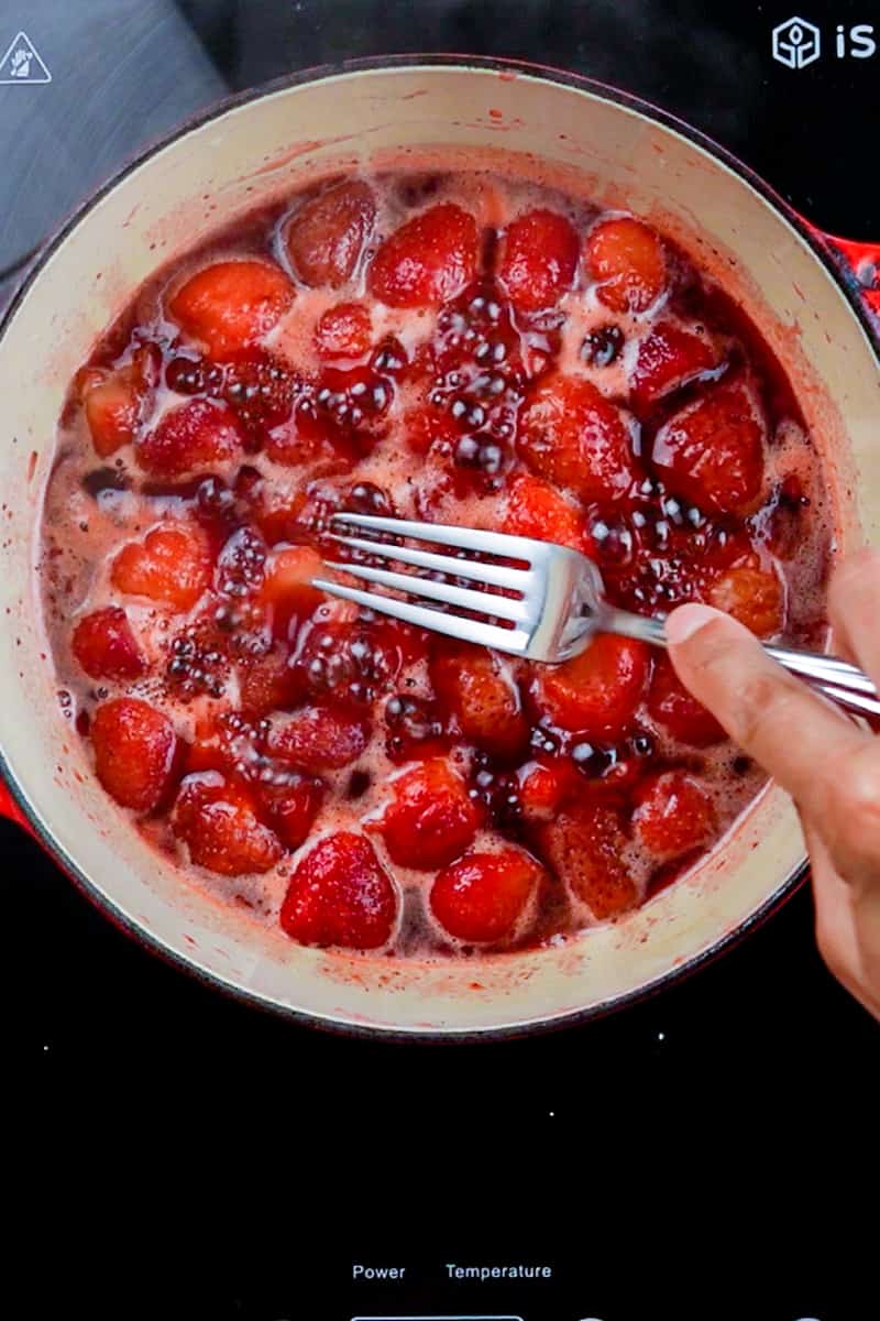Step 2. Break down strawberries with fork. Cook on medium heat periodically mashing.